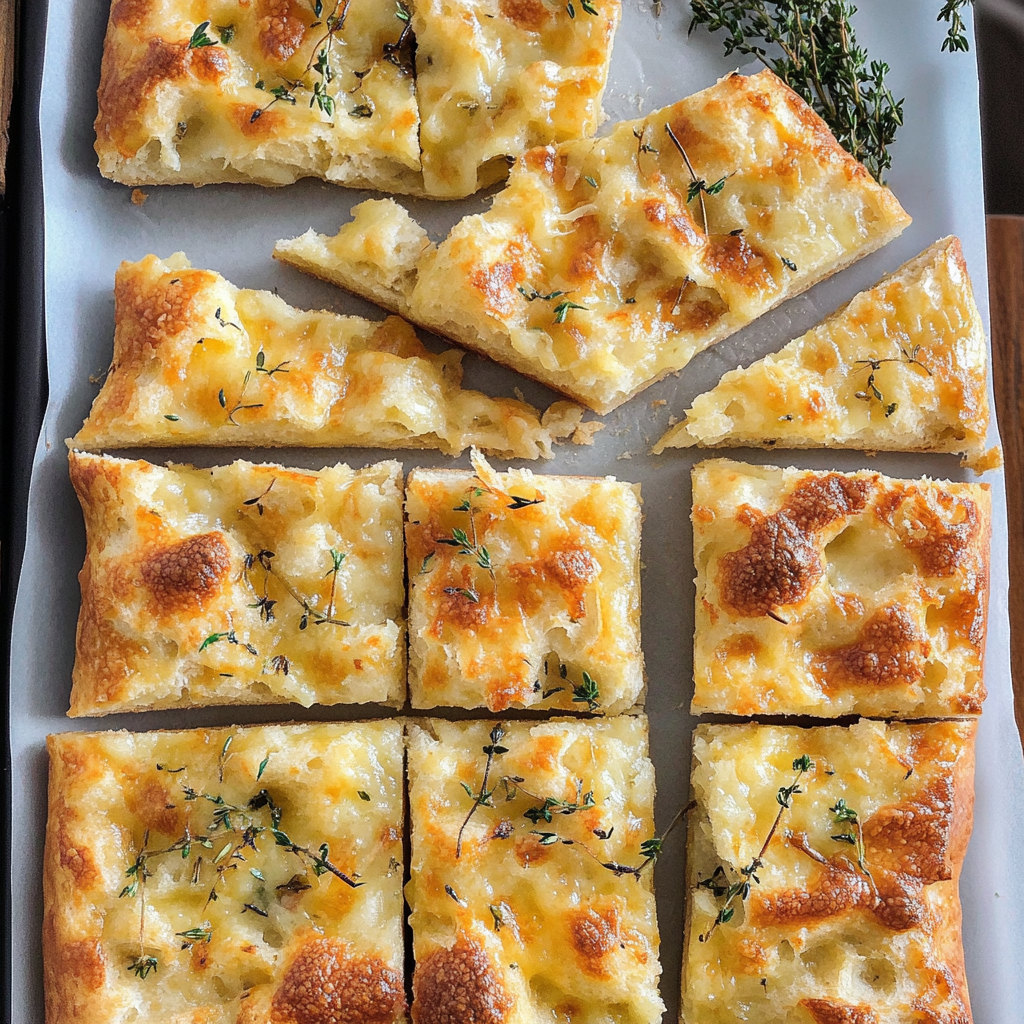 - This focaccia is visually stunning, showcasing a golden crust dotted with fresh herbs and melted cheese